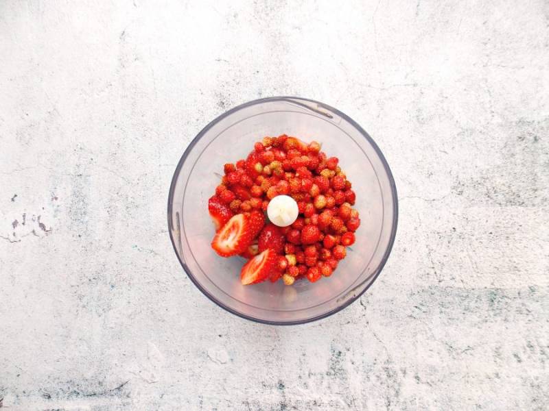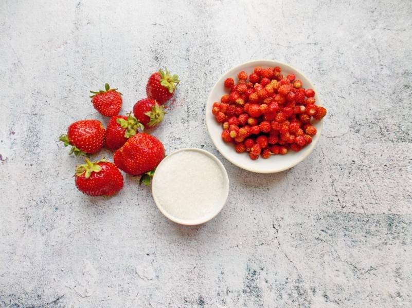 Подготовьте все необходимые ингредиенты для приготовления варенья из клубники и земляники. Ягоды переберите, сполосните и дайте воде полностью стечь. После этого удалите с ягод зеленые чашечки.
