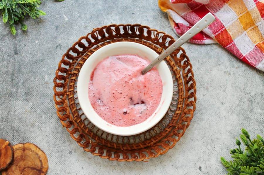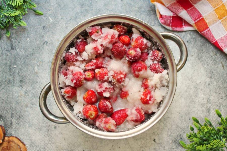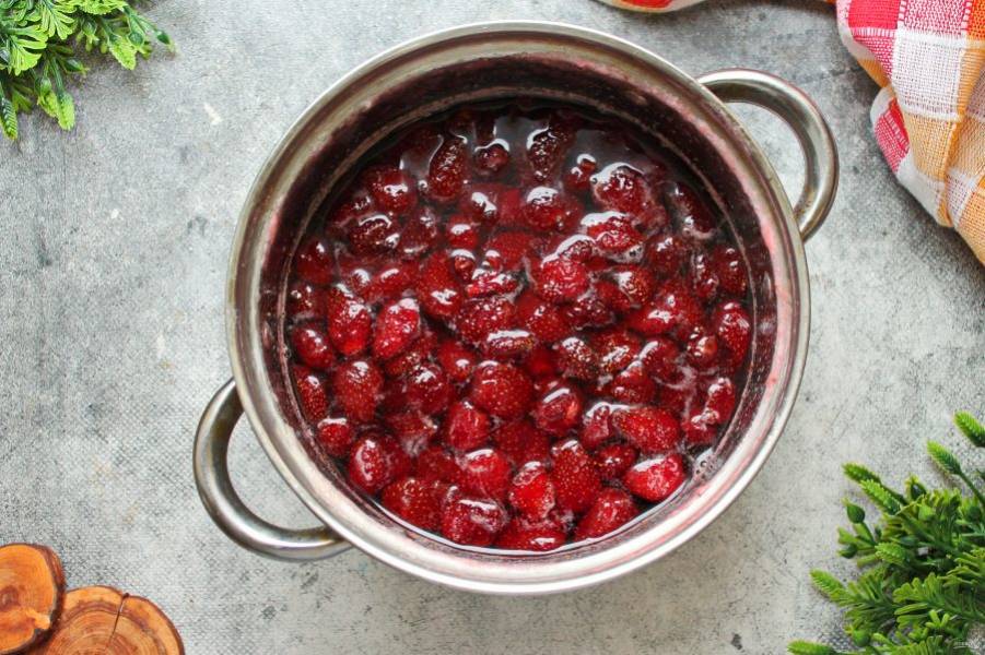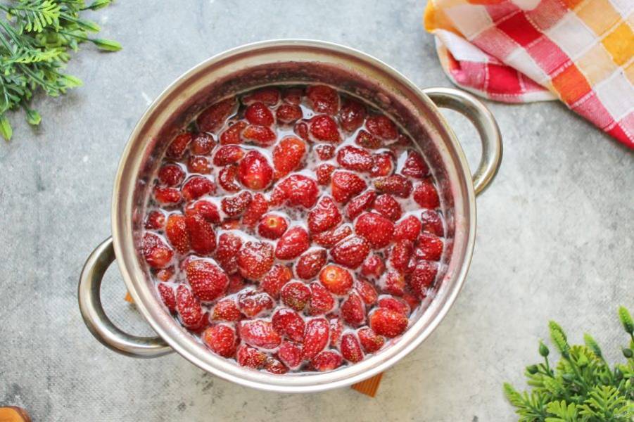 Накройте посуду чистой тканью и оставьте на 8 часов, чтобы клубника пустила сок.