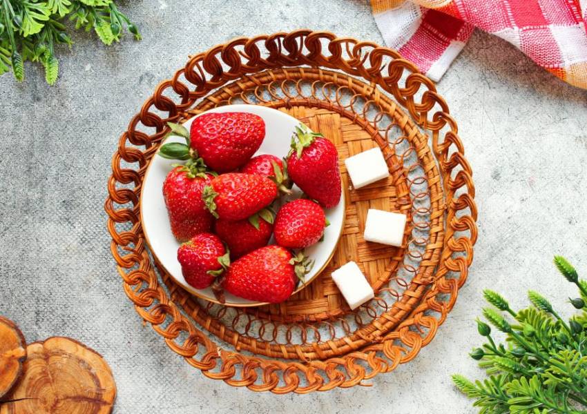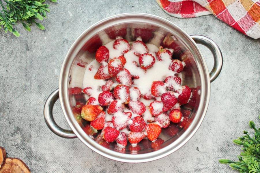 Подготовьте все необходимые ингредиенты для приготовления варенья из клубники пятиминутка.