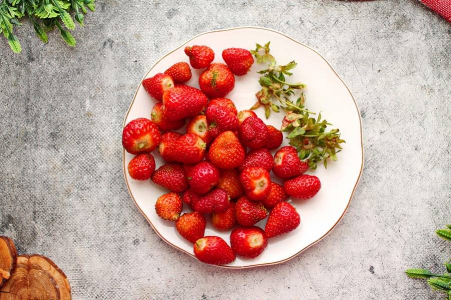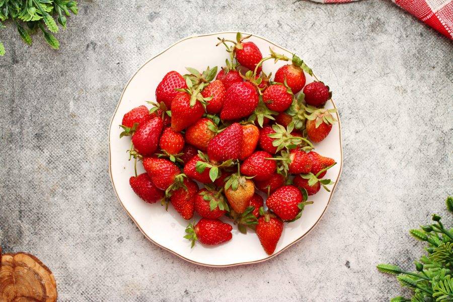 Клубнику тщательно переберите, удаляя порченные и мятые. Вымойте ягоды и откиньте на сито, чтобы вода полностью стекла.
