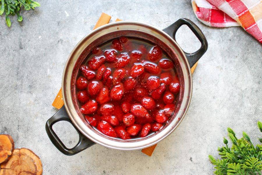 Выложите к соку с цедрой подготовленную клубнику и поставьте на медленный огонь, варите в течение 1 минуты после закипания, аккуратно перемешивая.
