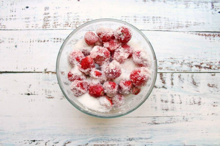 Добавьте к ягодам сахар и аккуратно перемешайте, стараясь не помять.