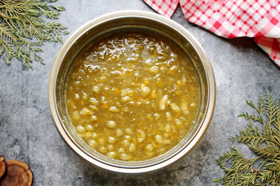 Поставьте все на средний огонь и доведите все до кипения. Убавьте огонь и варите варенье, убирая пену в течение 15 минут, иногда перемешивая.