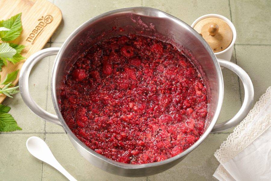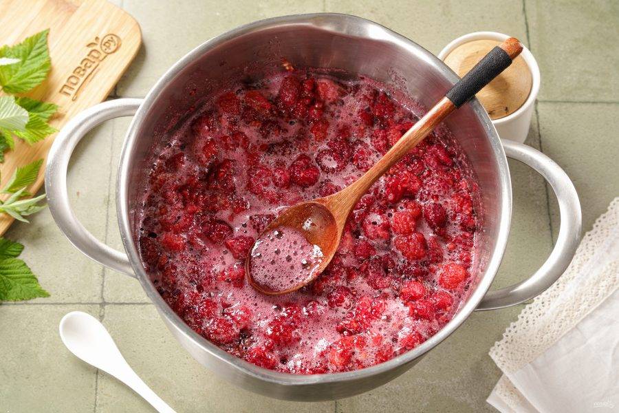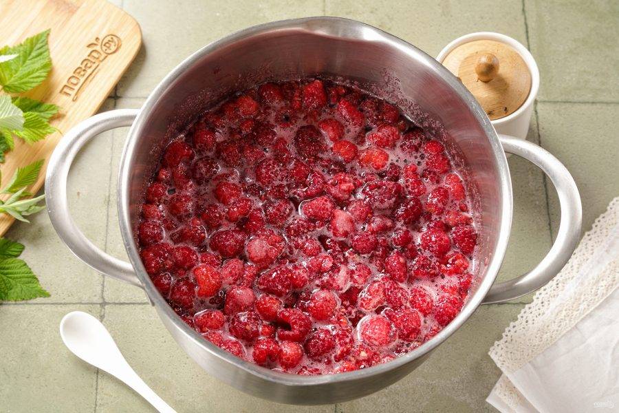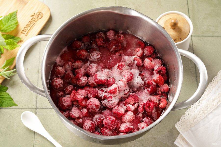 Поставьте малину на медленный огонь и дождитесь полного растворения сахарного песка.