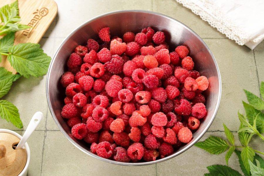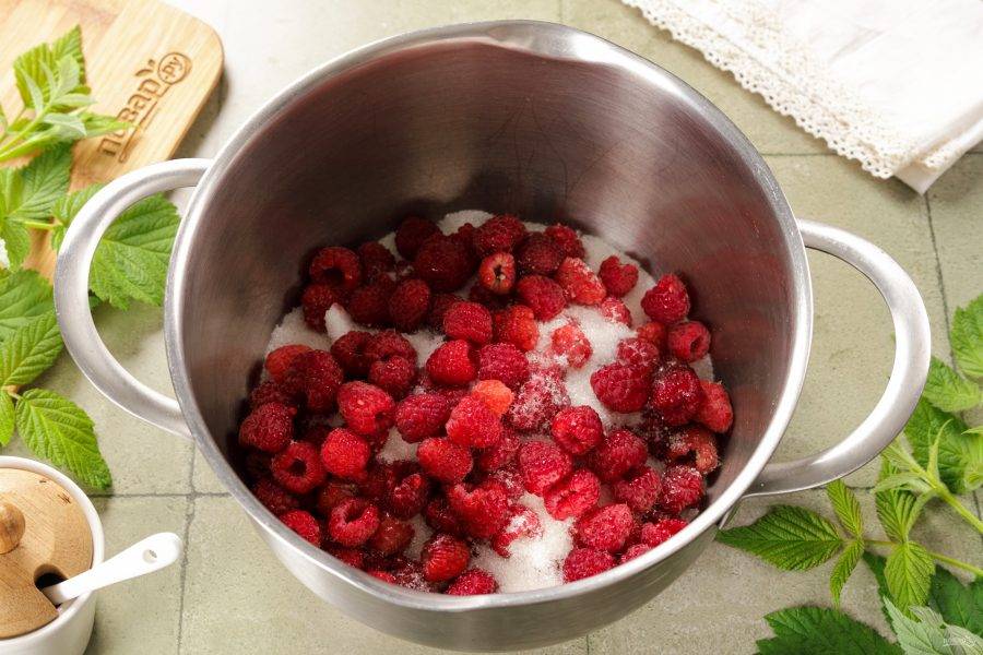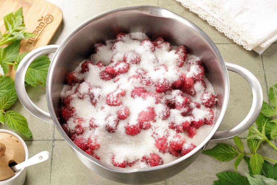 Накройте малину марлей или крышкой и оставьте на 3-4 часа, чтобы она пустила сок. Когда малина выделит сок, приступим к варке варенья.
