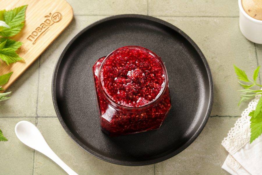 Доведите варенье до кипения и проварите 5 минут. Варенье из малины 5-минутка готово.