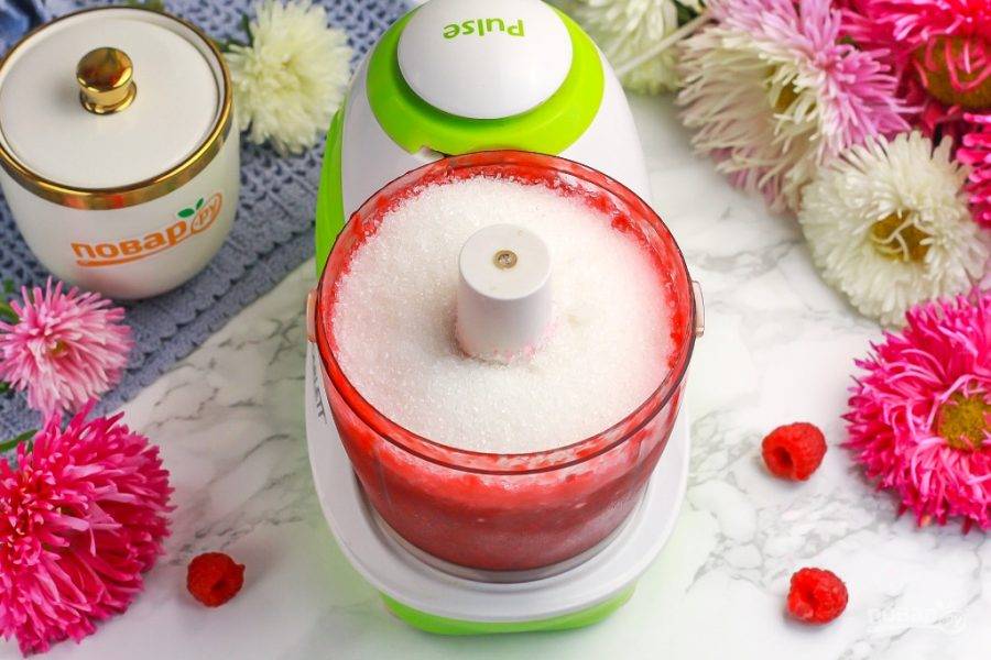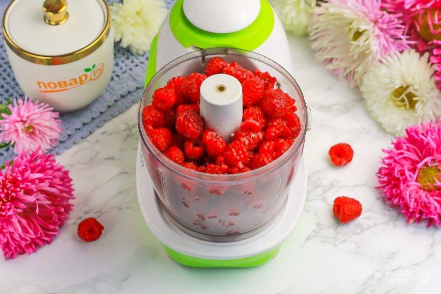 Затем переместите ягоды в чашу измельчителя, но только не блендера. Блендер измельчает и косточки, а в варенье они должны остаться целыми. Можно раздавить с помощью вилки, но на это уйдет больше времени. Отпюрируйте малиновую массу в течение 3-4 минут, чтобы все ягоды раздавились, а косточки — нет.