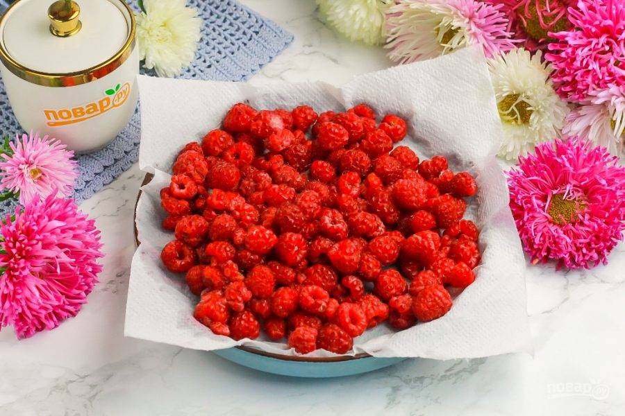 Застелите тарелку или блюдо бумажными салфетками и высыпьте туда малину, аккуратно промокните салфетками, стараясь не раздавить.