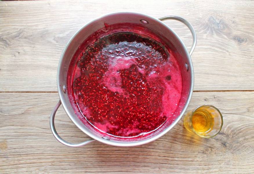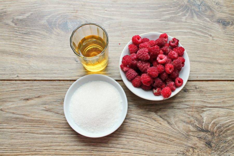 Подготовьте все необходимые ингредиенты для приготовления варенья из малины с коньяком.