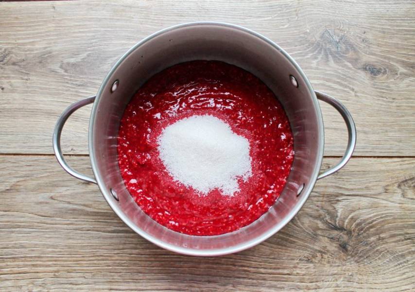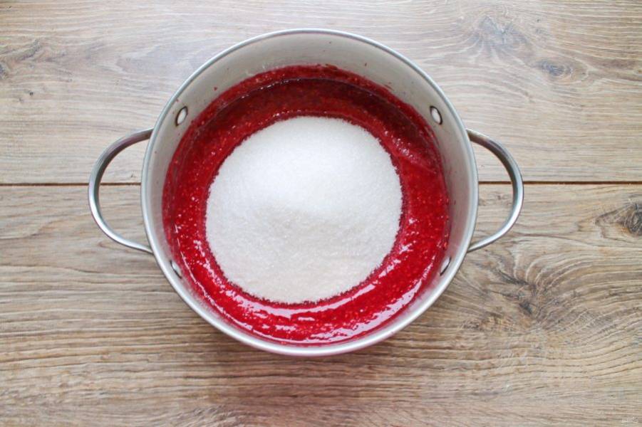 Переложите малину в кастрюлю и добавьте пектин, смешанный с двумя ложками сахара, перемешайте.