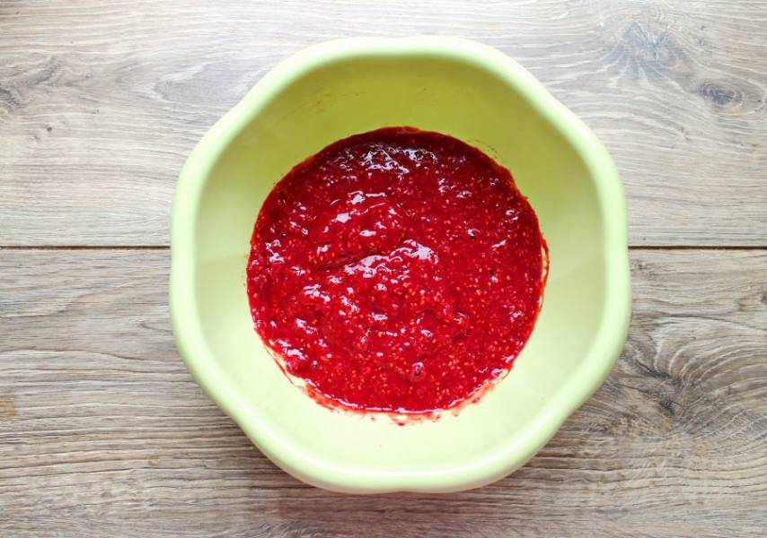 Малину переберите, сполосните и полностью обсушите. Пробейте малину блендером до пюреобразного состояния.
