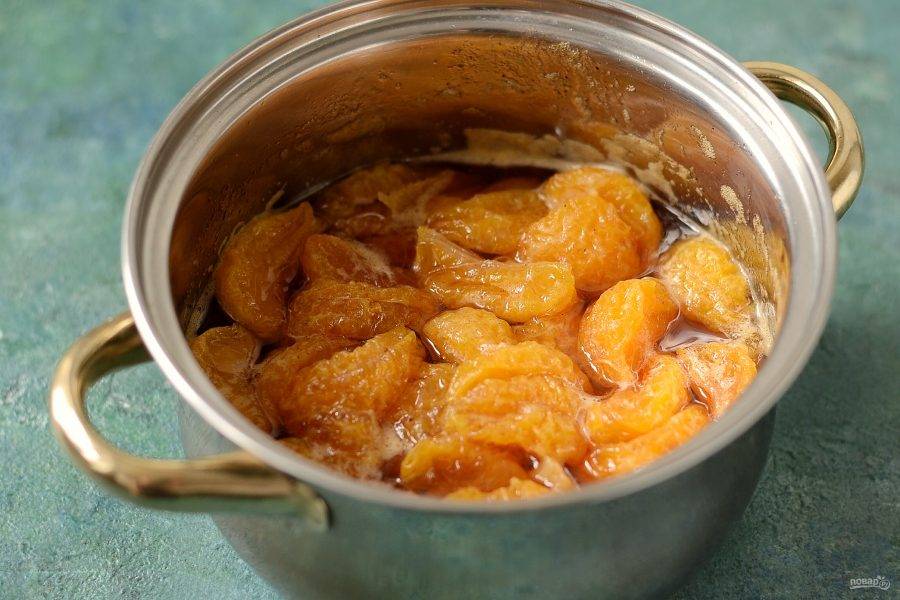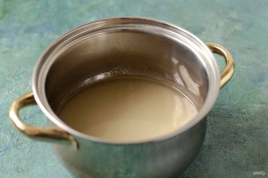 Насыпьте сахар в кастрюлю, добавьте воду. Поставьте на средний огонь, доведите до кипения. Дайте провариться сиропу 5 минут.