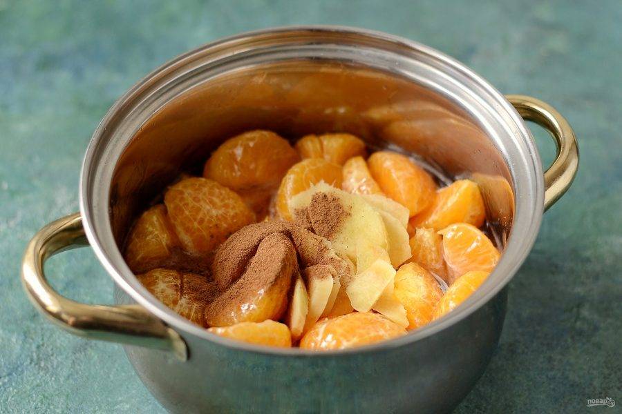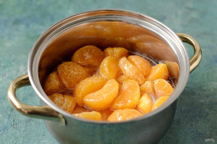 Переложите мандарины в кастрюлю. Перемешайте, чтобы они покрылись сахарным сиропом.
