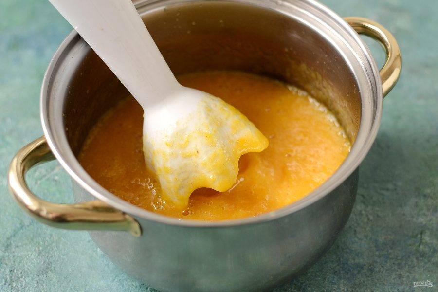 Снимите кастрюлю с огня, вытащите имбирь. Измельчите мандарины погружным блендером до однородной консистенции. Снова поставьте кастрюлю на средний огонь. Проварите варенье 5-7 минут после закипания.