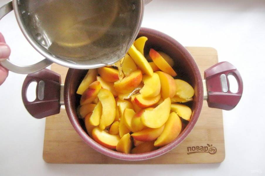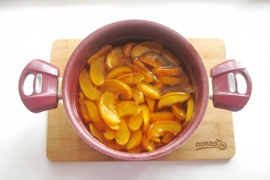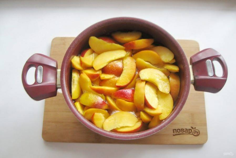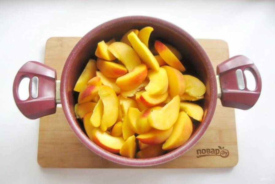 Нарезанные персики выложите в кастрюлю с толстым дном.