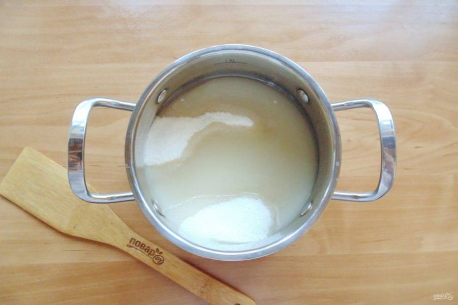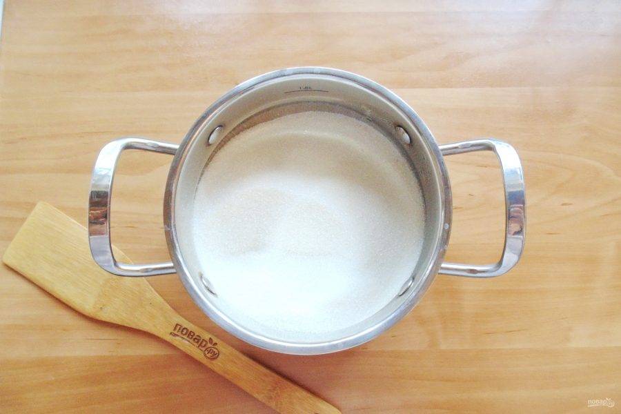 Приготовьте сироп. В кастрюлю всыпьте сахар.