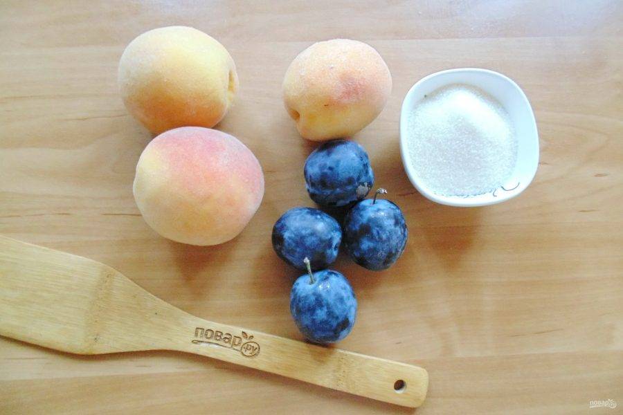 Подготовьте ингредиенты для приготовления варенья из персиков и слив.