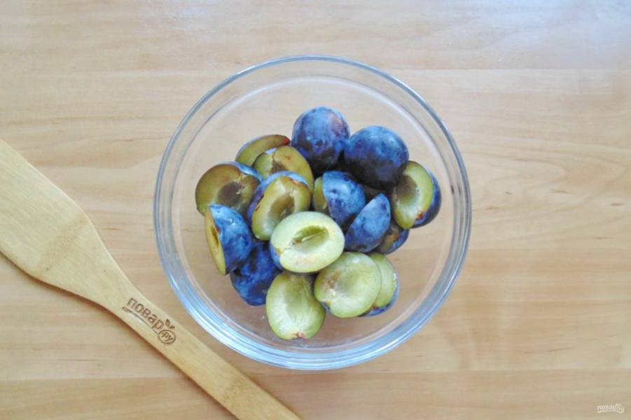 Сливы разрежьте на половинки и удалите косточки.