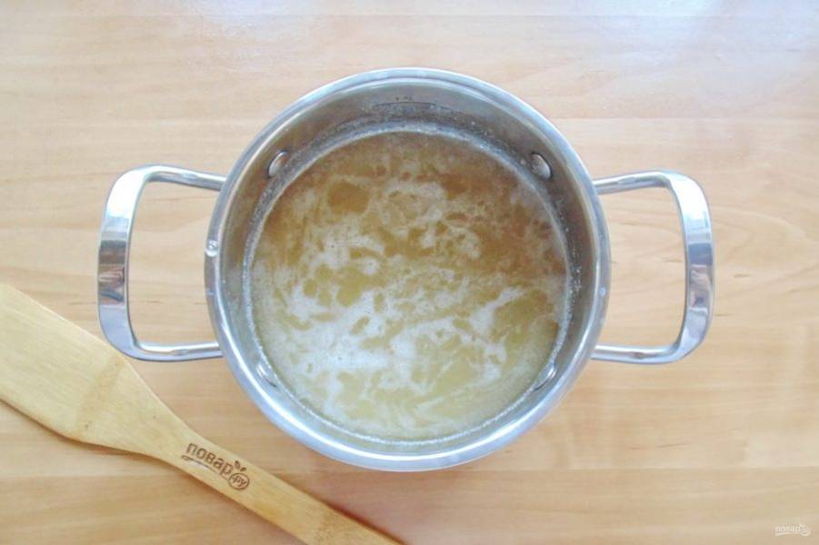 Поставьте кастрюлю на огонь. Помешивая, доведите до кипения и полного растворения сахара.