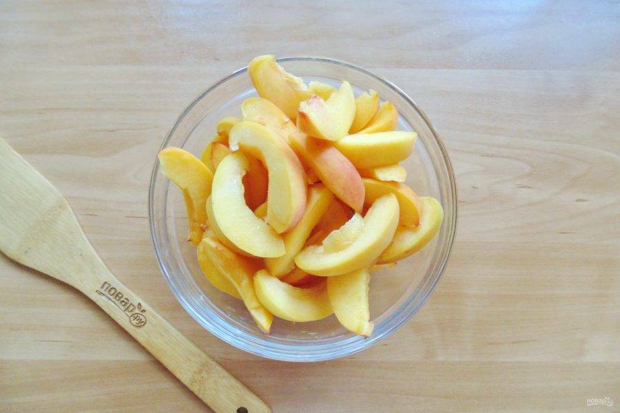 Из персиков удалите косточку и нарежьте небольшими дольками.