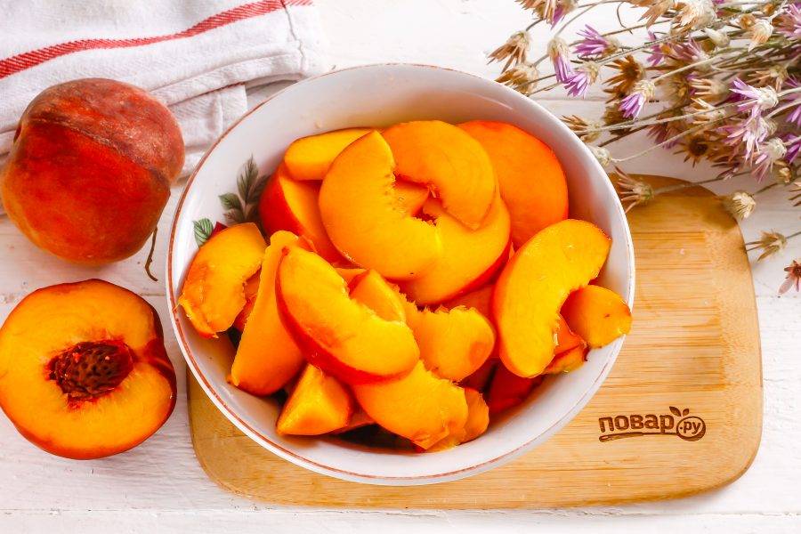 Персики промойте в воде, удаляя весь ворсистый слой с поверхности фруктов. Разделите на две части и удалите косточку. Нарежьте ломтиками или кубиками.