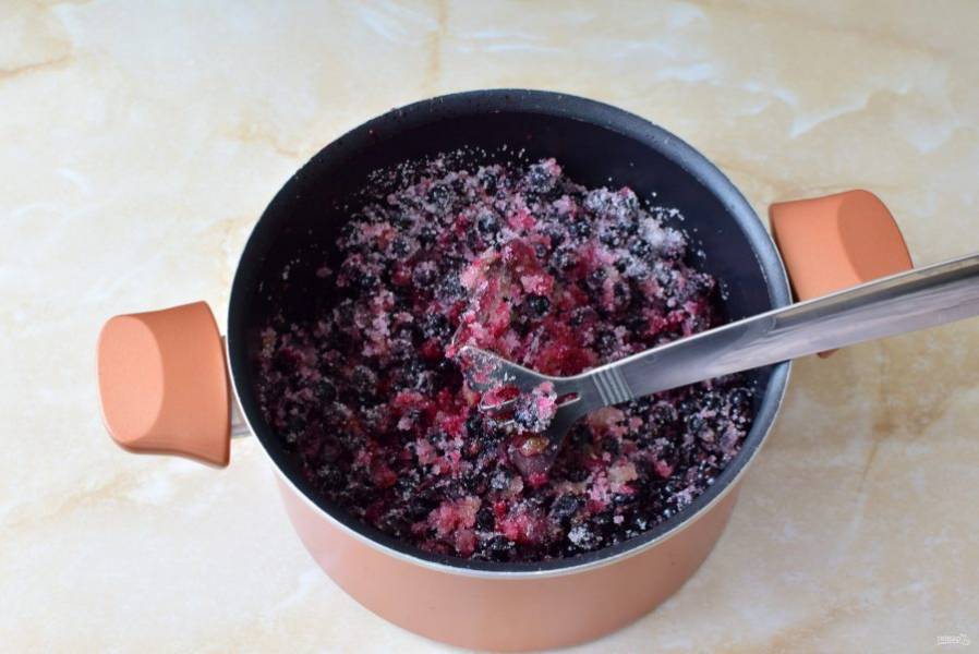 Теперь разомните ягоды в сахаре с помощью толкушки. Ягоды пустят сок. Необходимо получить такую консистенцию, чтобы сразу ставить варить.
