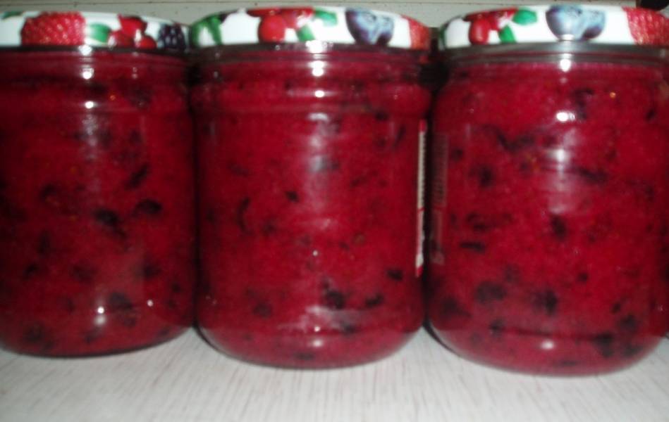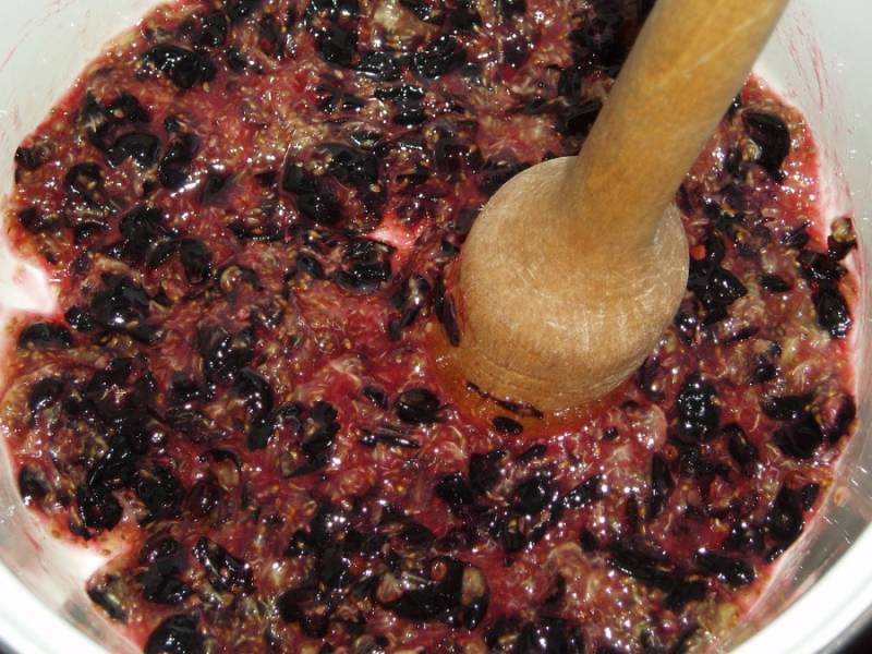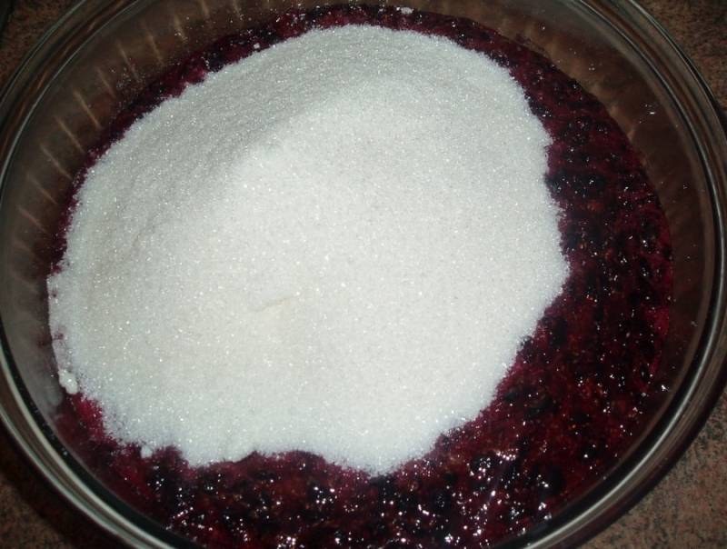 Когда смородина превратилась в более или менее однородную массу, всыпаем в миску с ней сахар.