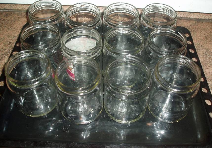 Затем стерилизуем банки и крышки, поместив их в разогретую до 100 градусов духовку.