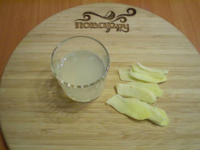 С лимона отожмите сок, процедите его (косточек быть не должно). Имбирь нужно очистить от кожуры и нарезать тонкими полосками.