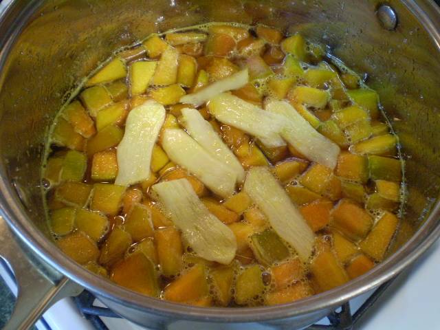 Имбирь придаёт тыкве новые аромат и вкус. К тому же, он является отличным консервантом. Но я не стала оставлять его в банках: он присутствовал лишь при варке, перед закаткой я его вынула из кастрюли.