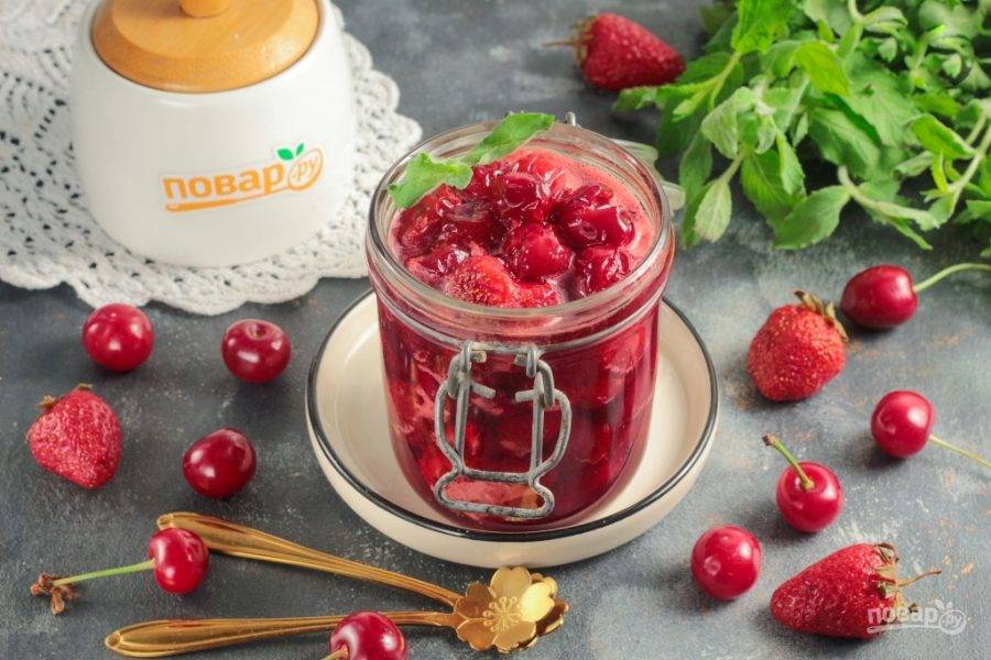 Потрясающий вкус дуэта вишни и клубники оценят все сладкоежки. Варенье получается очень насыщенным, ароматным за счет того, что проваривается несколько раз подряд и охлаждается.