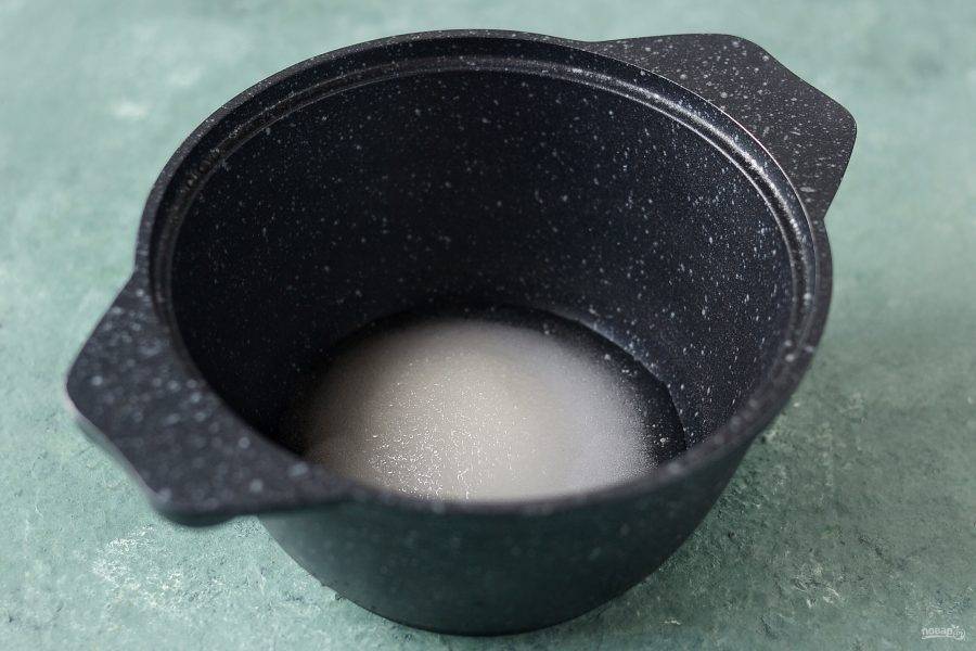 В кастрюле с толстым дном соедините сахар и воду. Доведите до кипения, подождите, пока сахар полностью растворится.