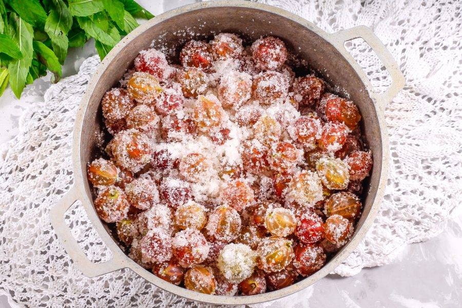 Добавьте сахар и перемешайте. Оставьте на 20-30 минут, чтобы ягоды пустили сок.