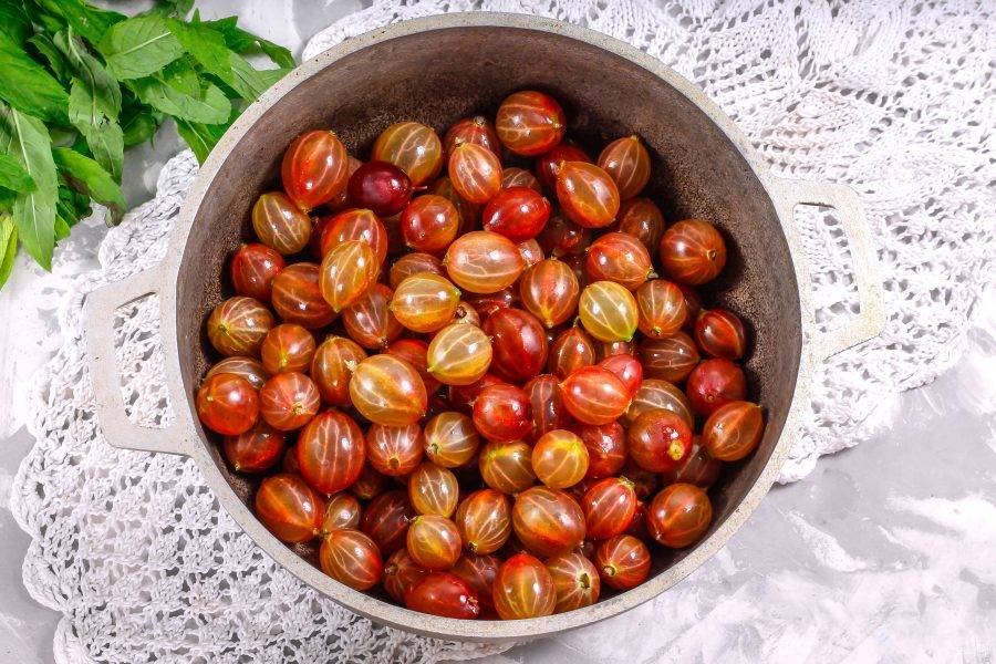 Крыжовник промойте в воде, удалите хвостики с обеих сторон ягод.
