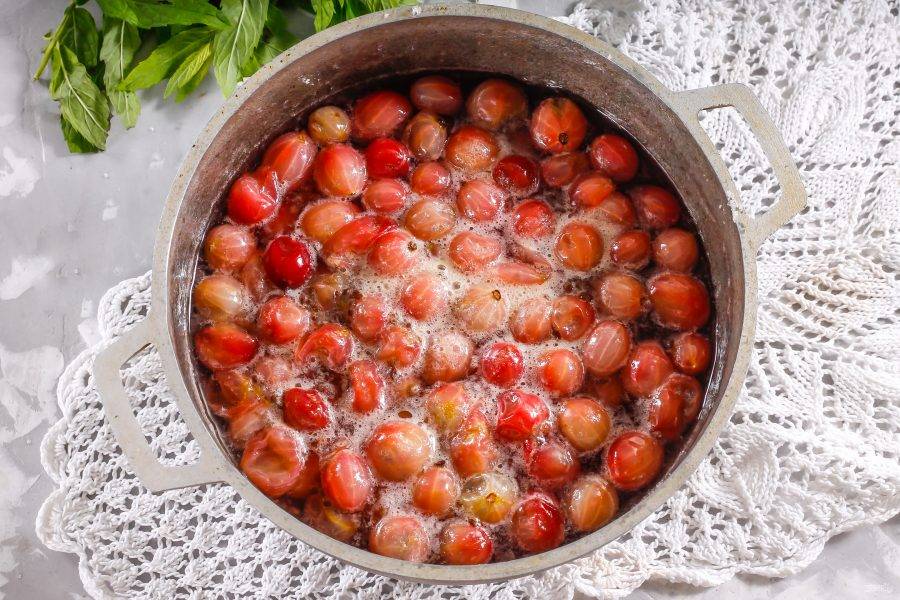 Поместите емкость на плиту и прогрейте на среднем нагреве, отсчитывая ровно 5 минут с момента закипания сиропа. На сильном нагреве не варите - все ягодки полопаются.