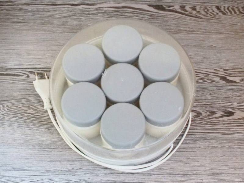 Закройте крышками. Включите йогуртницу и оставьте на 8 часов. По истечении времени, баночки переставьте на 4 часа в холодильник.