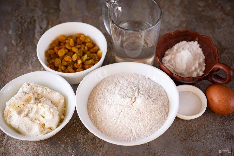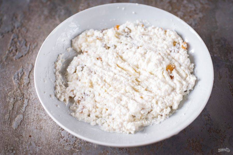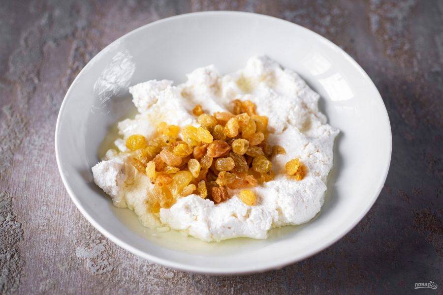 Приготовьте творожную начинку, для этого в тарелку выложите весь творог, добавьте яичный белок и изюм.