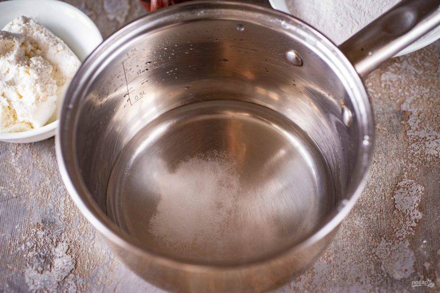 В сотейник с толстым дном залейте воду и добавьте соль. Поставьте на средний огонь и дождитесь момента закипания.