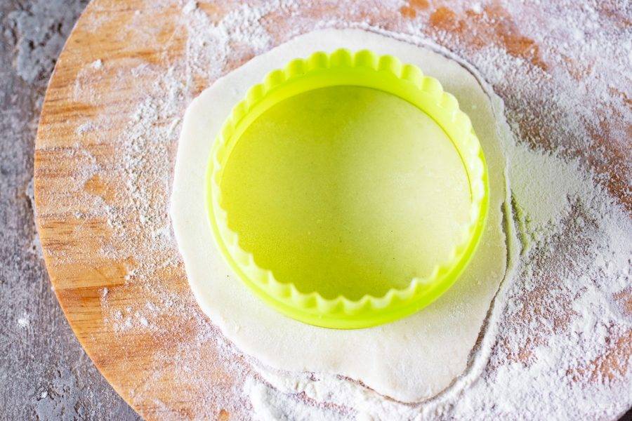 Теперь приступайте к формовке самих вареников. Хочу предупредить, что это очень непросто — рисовая мука не клейкая и тесто очень хрупкое, норовит порваться. Поэтому потребуется некоторая сноровка — я пару штук вареников испортила прежде, чем у меня получился удовлетворительный результат. Сначала хорошенько припылите рабочую поверхность рисовой мукой, затем отщипывайте небольшую часть теста и очень аккуратно раскатывайте в лепешку, но она при этом не должна быть очень тонкой — 2-3 мм. толщиной примерно. Я подравняла лепешку кондитерской вырубкой.