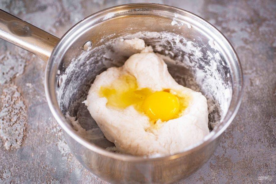 - Яйцо 1 штука желток — в тесто, а белок — в творожную начинку