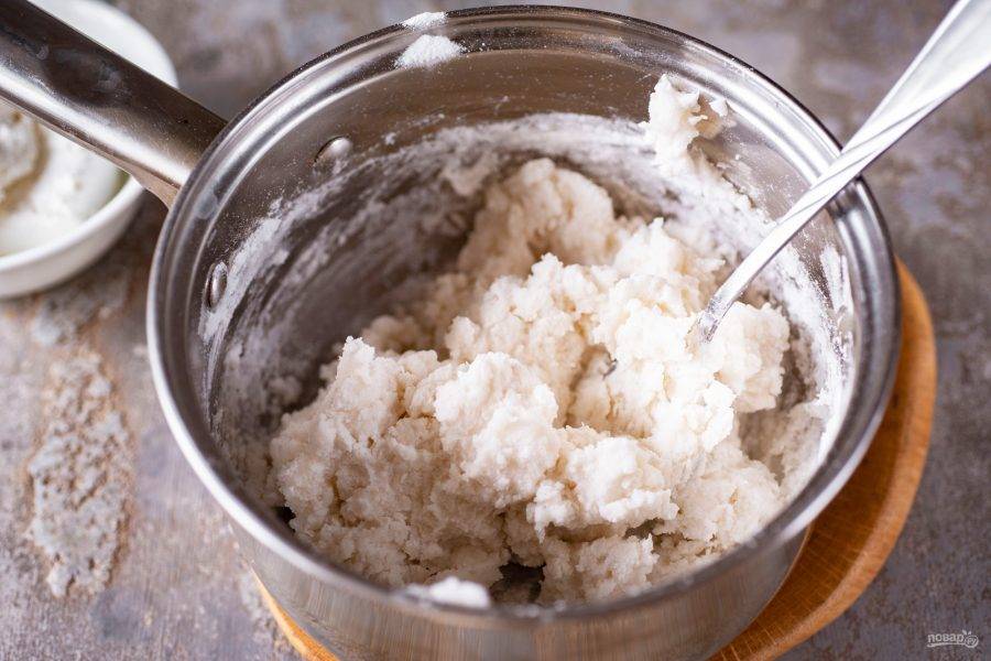 В заваренное и охлажденное рисовое тесто добавьте желток. Вмешайте его, у вас должно получиться довольно вязкое тесто.