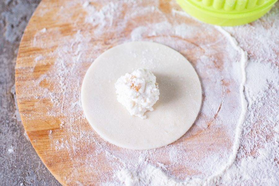 На центр лепешки выложите 1 ч.л. творожной начинки.