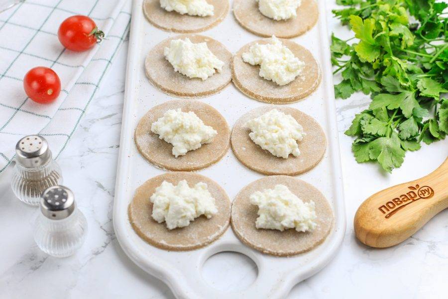 Разделите тесто на несколько частей, теперь оно станет пластичным и будет легко раскатываться. Раскатайте его в округлый пласт и вырежьте стаканом круги, обмакивая стакан в муку. Перемешайте творог с солью и выложите на каждый круг немного начинки. Если любите сладкие вареники, то добавьте в начинку 40-50 грамм сахара.
