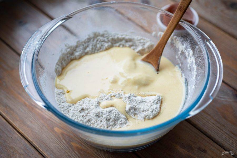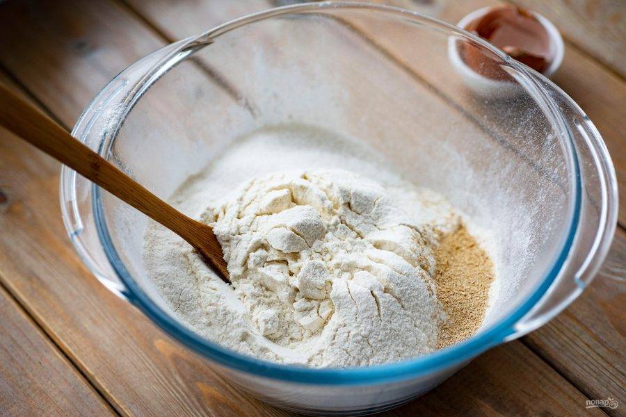 Просейте в отдельную сухую миску муку, к ней добавьте сухие дрожжи и сахар (25 грамм). Перемешайте эти сухие ингредиенты ложкой до равномерного их распределения по массе.