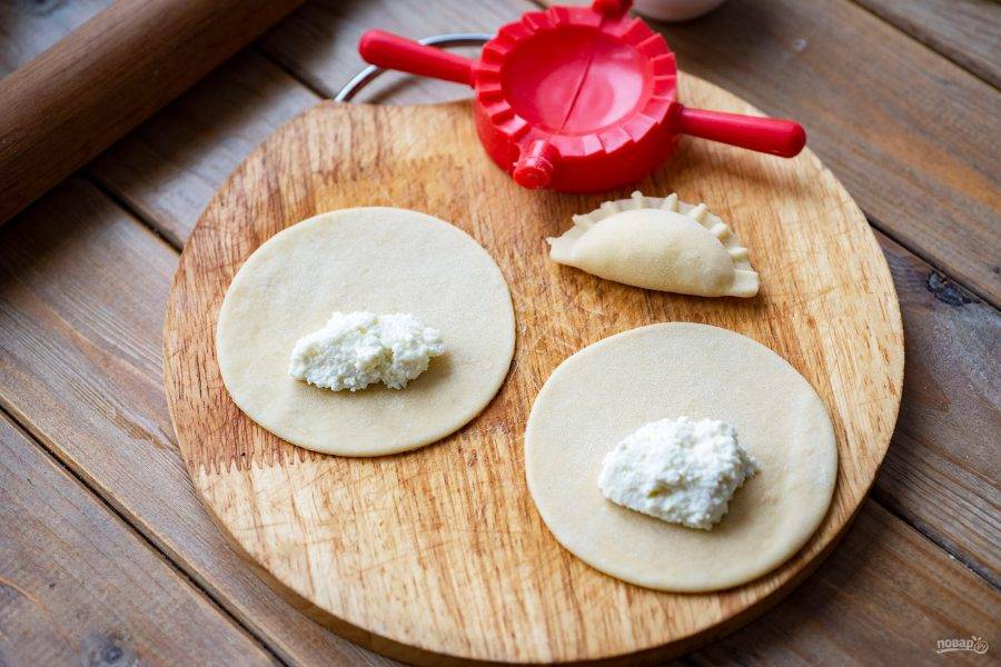 На каждый такой круг из теста выложите по одной чайной ложке творожной начинки. Края теста защепите удобным способом, у меня пластиковое устройство для приготовления вареников, но можно и вручную аккуратно защепить края.