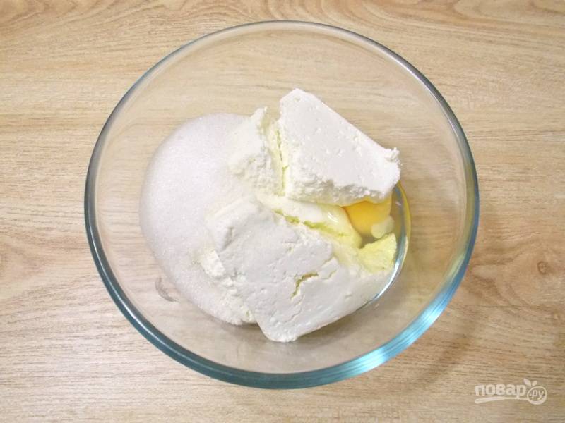 В чаше соедините творог, сахар и яйцо. Перемешайте до однородного состояния.