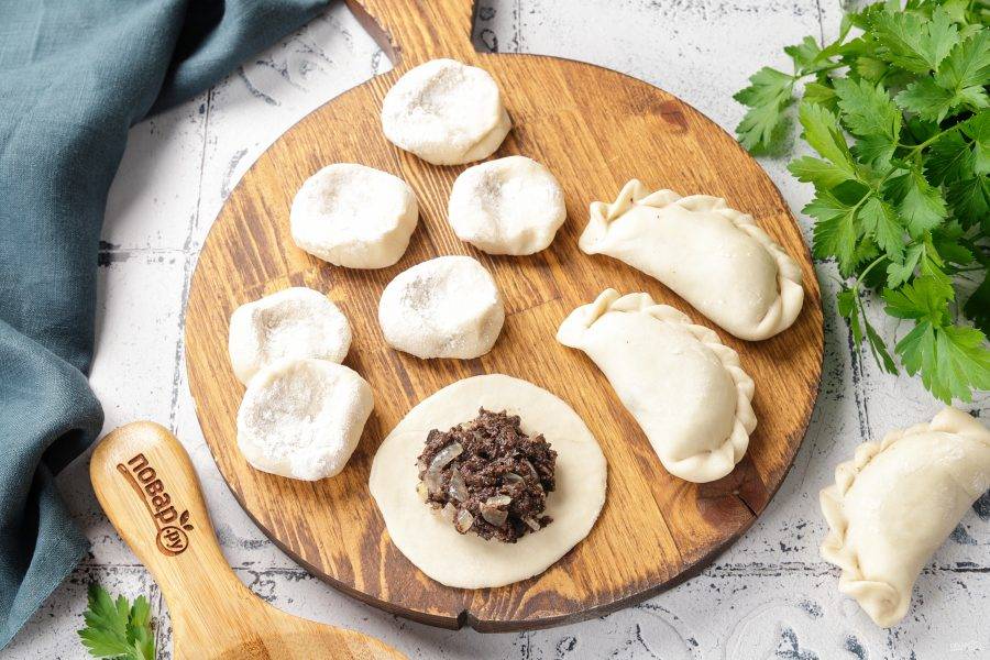 Обваляйте каждый кусочек с двух сторон в муке и раскатайте в форме круга. По центру выложите начинку и сформируйте вареники любым удобным для вас способом.