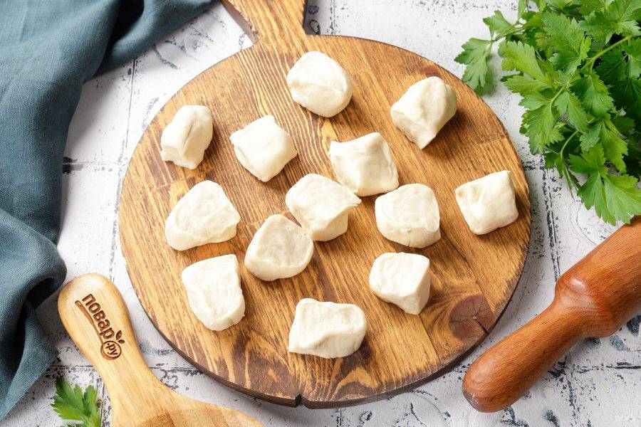 От теста отрежьте кусок, раскатайте его колбаской и нарежьте на небольшие кусочки.