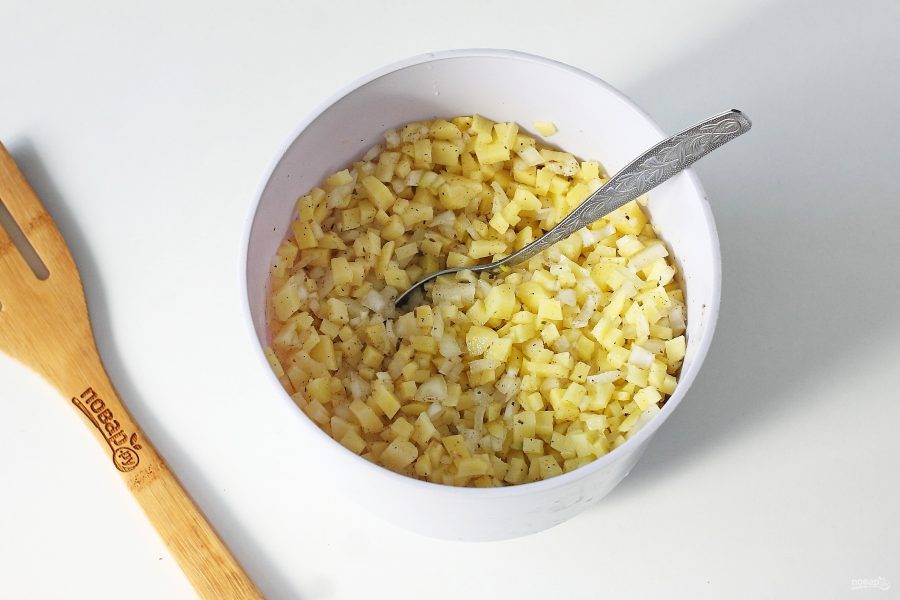 Тем временем картофель нарежьте мелкими кубиками, чем меньше получится, тем лучше.