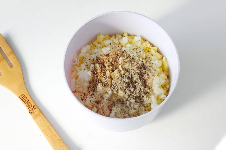Добавьте нарезанный мелкими кубиками лук, соль, масло и любимые специи.